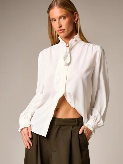 Balloon Sleeve Asymmetrical Button Down Fitted Blouse