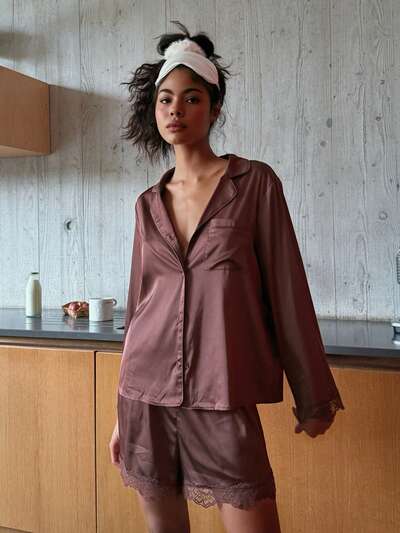 Conjunto de pijama con ribete de encaje satinado y camisa de manga larga