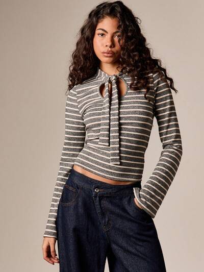 ストライプ柄長袖ポロシャツとワイドレッグパンツ-20%
