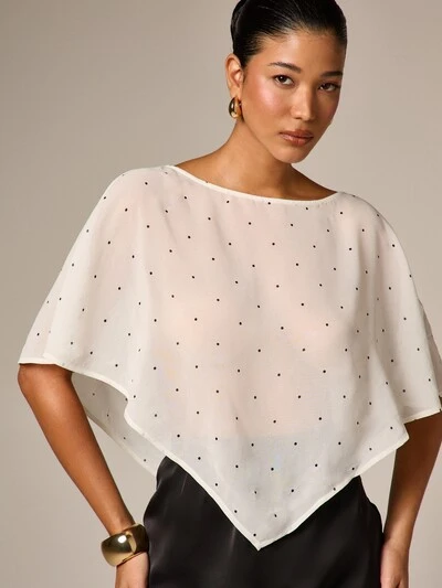 비대칭 밑단이 있는 시스루 도트 블라우스