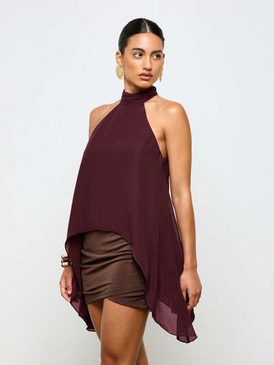 홀터넥 워터폴 비대칭 슬리브리스 블라우스레이스 디테일이 돋보이는 비대칭 티셔츠 (대조적인 트림 장식)