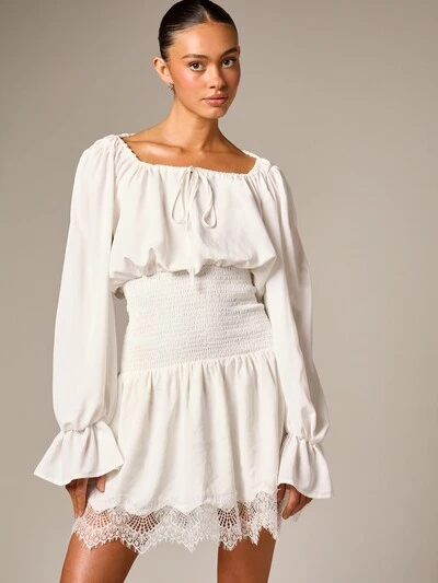 Off Shoulder Ruffle Mini Dress With Smocked Waist