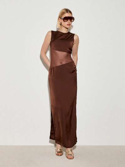 Satin Sleeveless Color Block Panel Design Maxi Dress-20%
